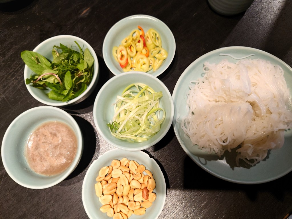 Meanwhile, we dip fried fishes even fried green onions and dills into shrimp paste which is special kind of fish sauce in Vietnam, by the way we could eat attaching peanut, chili, noodle and herbs.