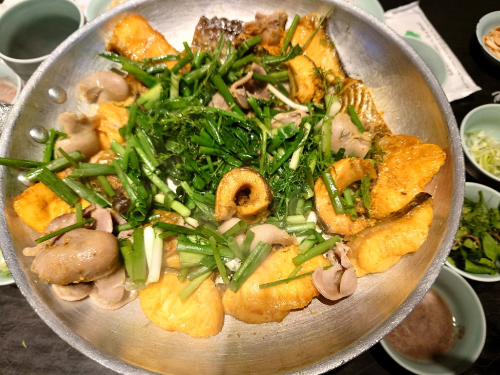 The special thing of this dish is fried fishes on the pan to be kept hot, after that we fill green onions and dills to fry with. As you know, normally we eat only little these vegetables like herbs, but here, they are main ingredients.